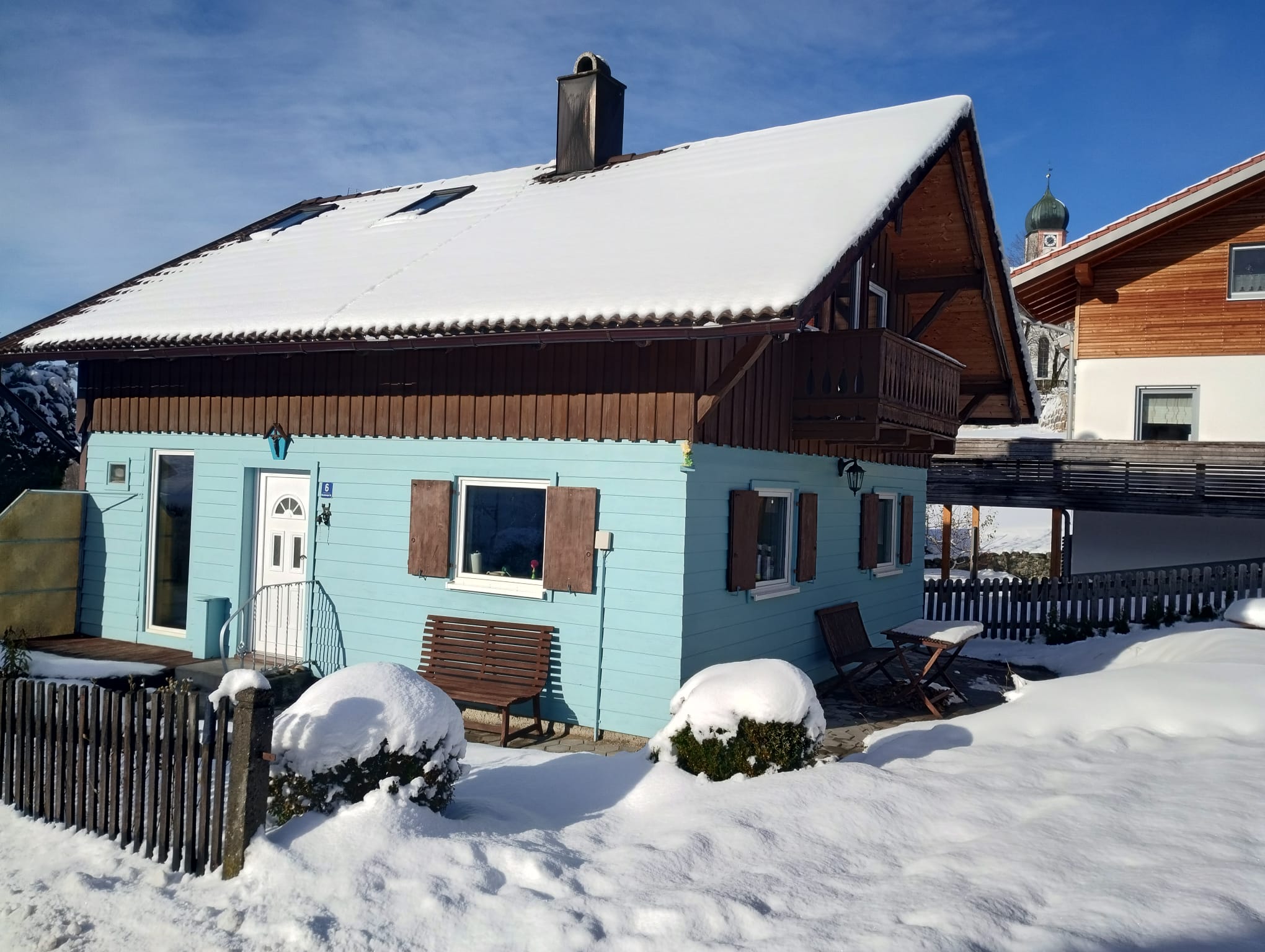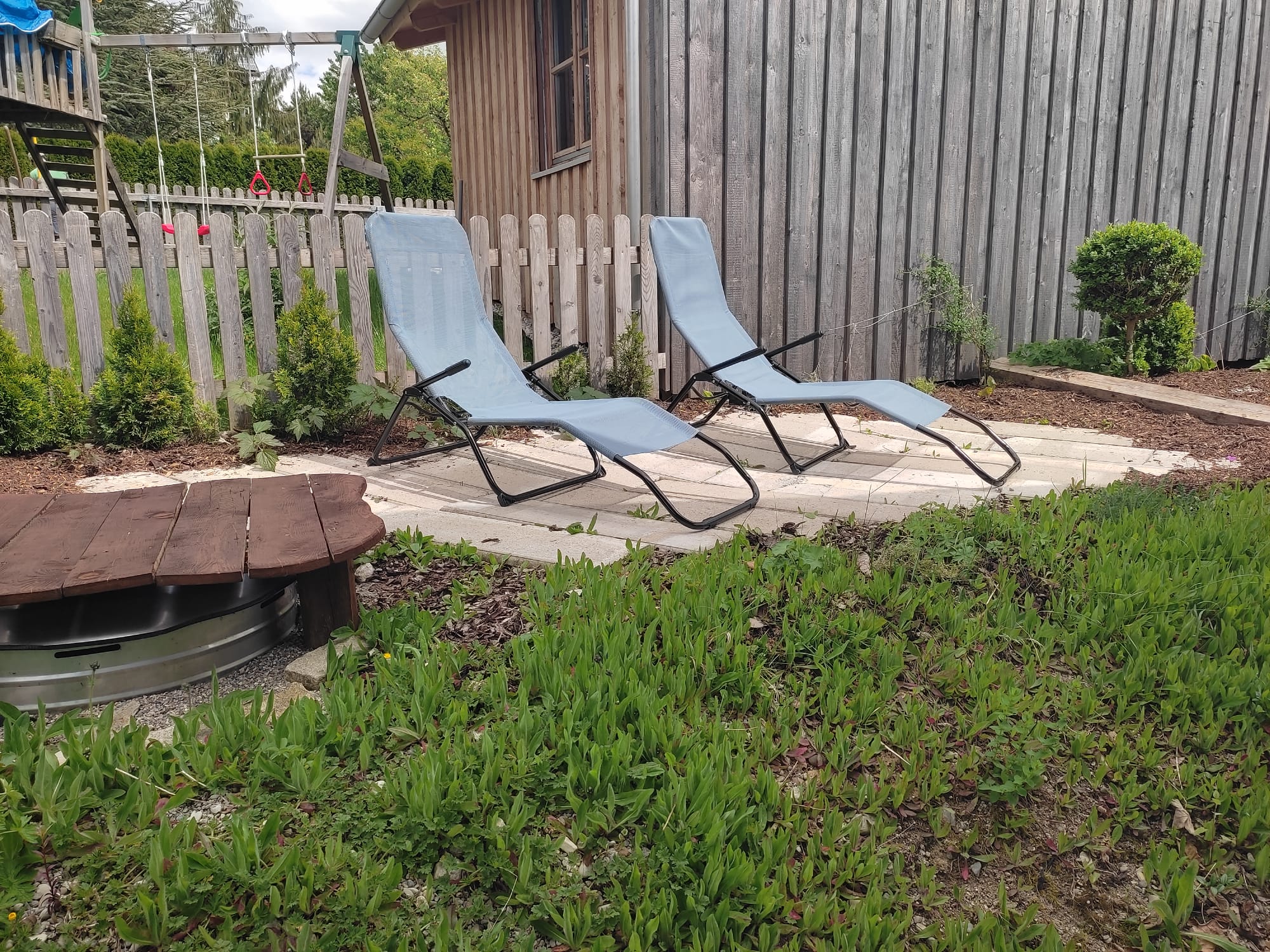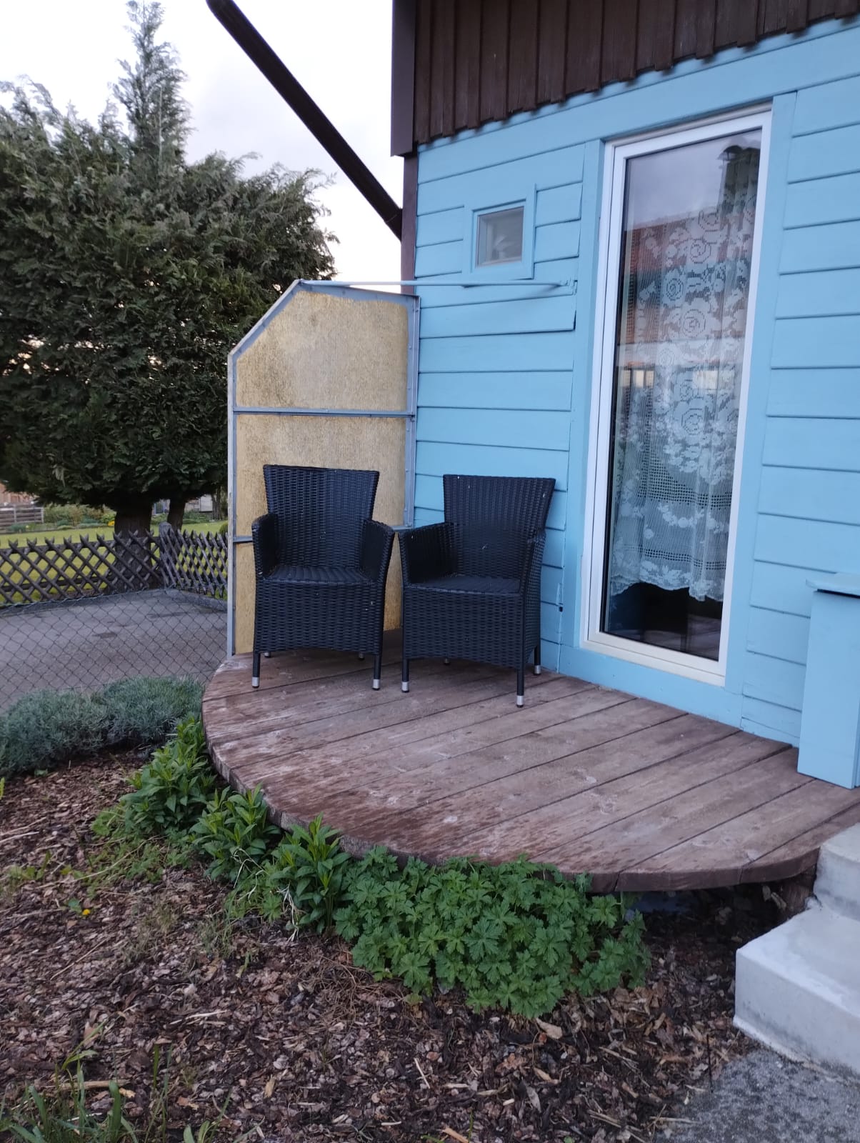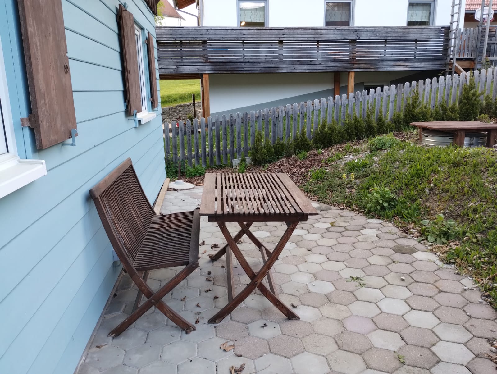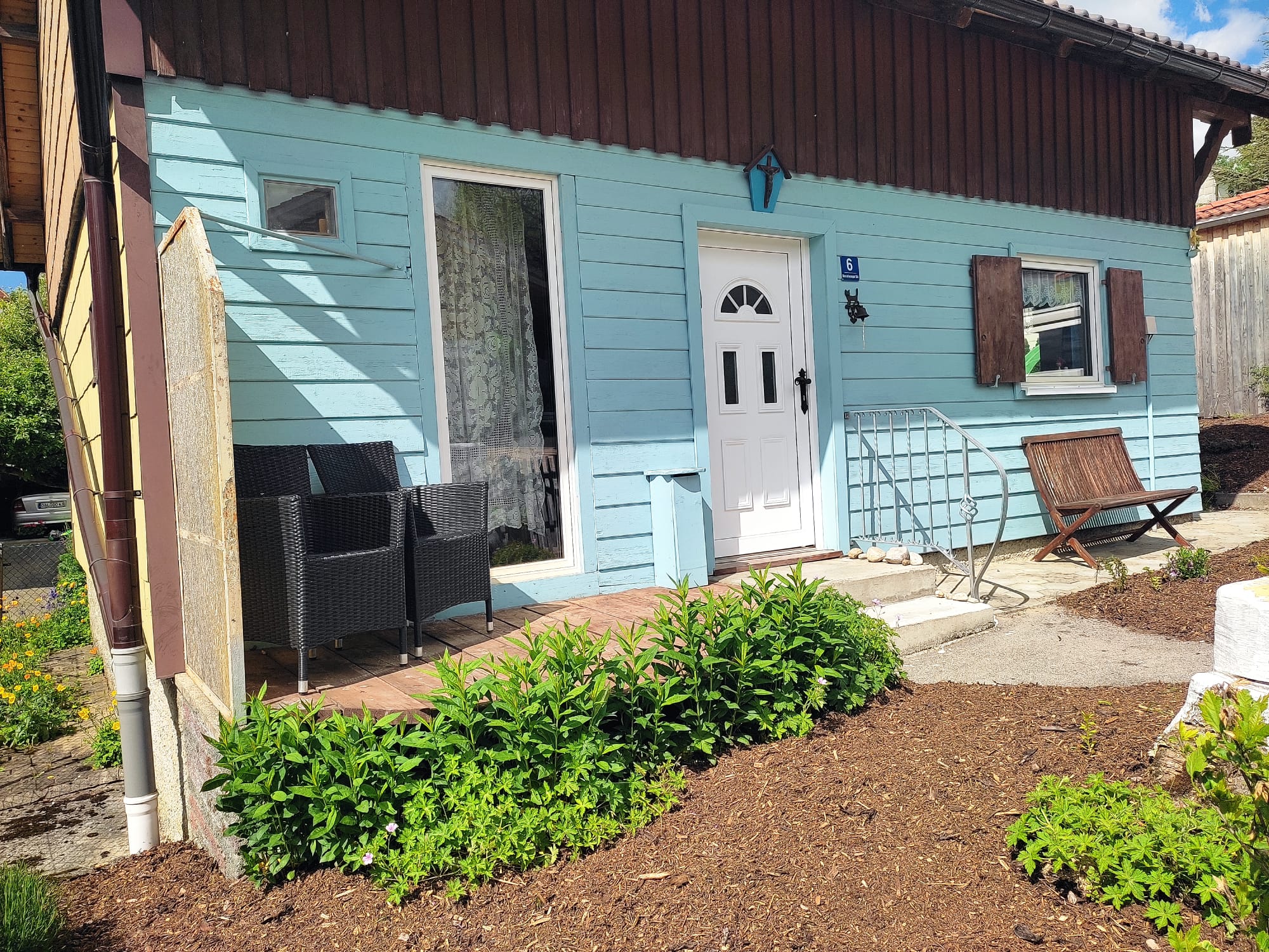 - Südseite kleine Terrasse mit Stühlen und eine Hausbank