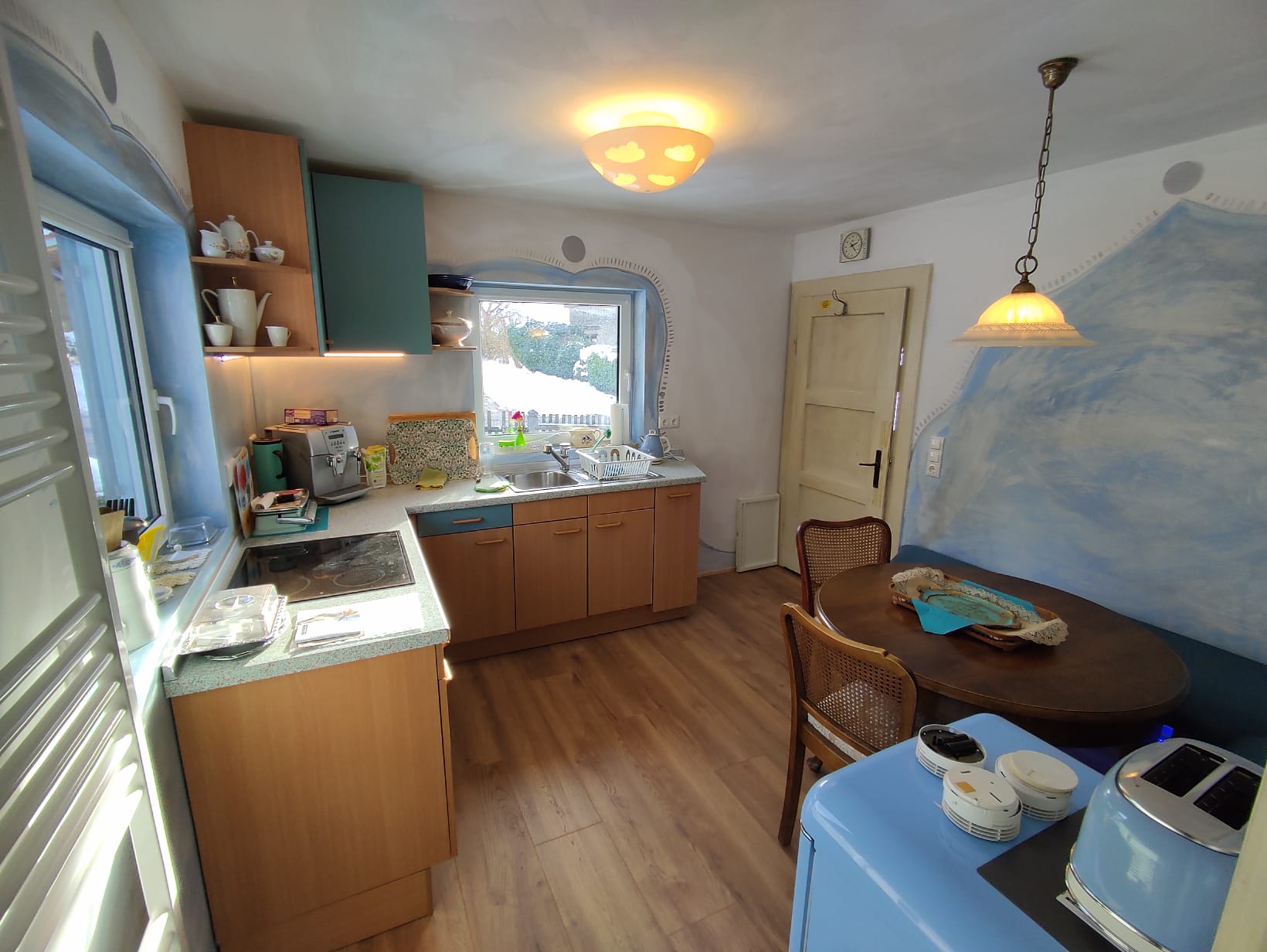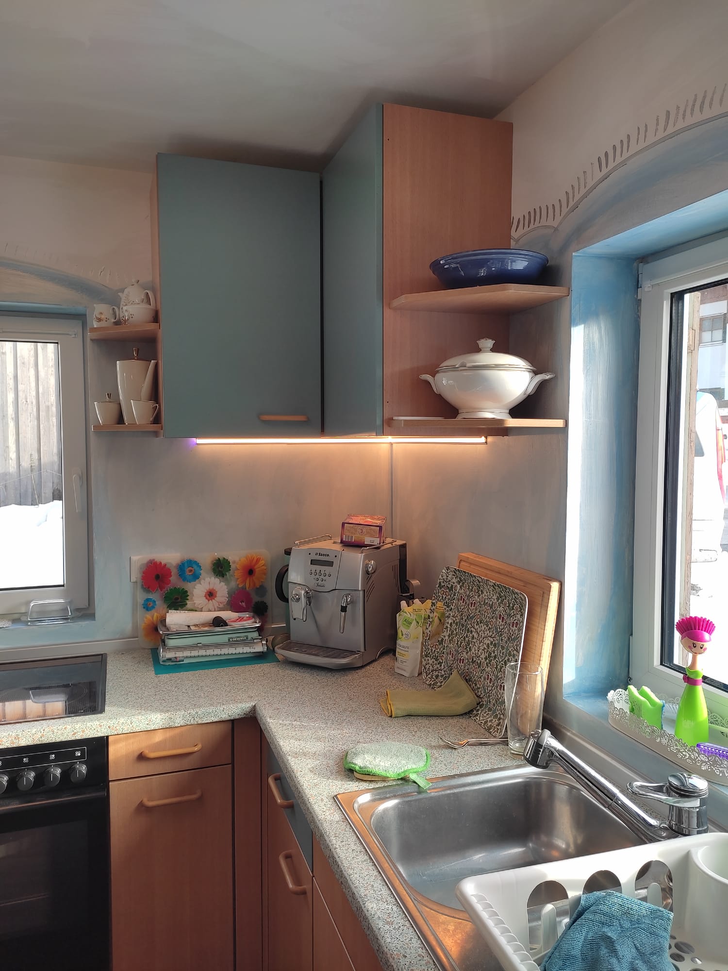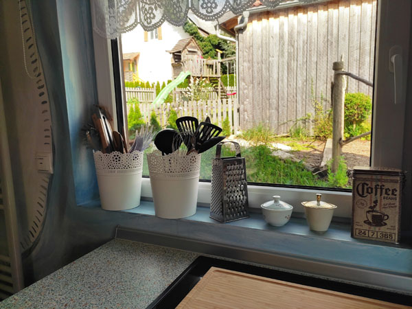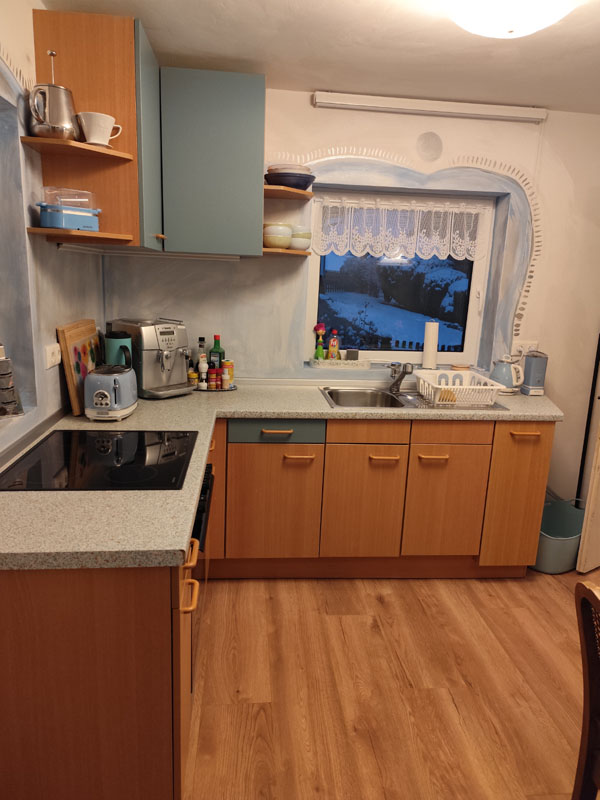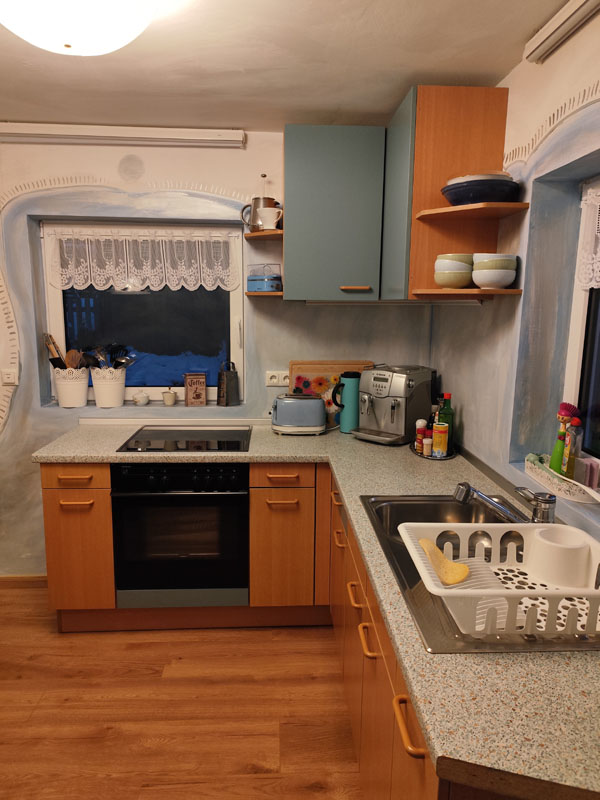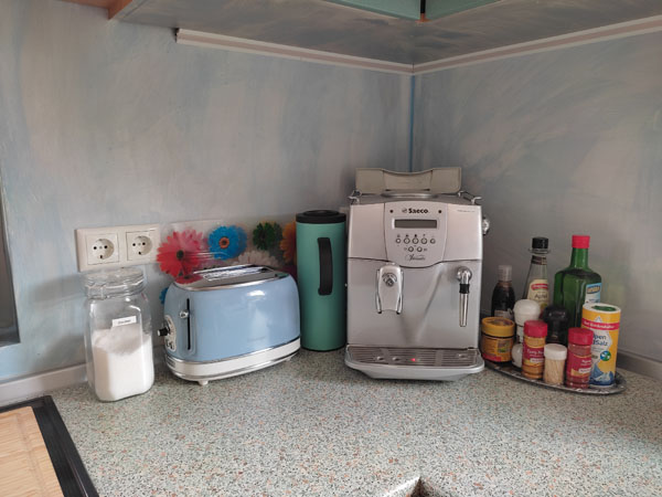 - Verbrauchsartikel wie Kaffeebohnen, Mehl, Salz, Zucker, Klopapier, Zewa, Putzmittel, etc. sind vorhanden. Jedoch sollten sie je nach Verbrauch nachgekauft werden.