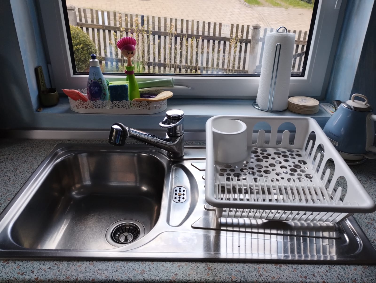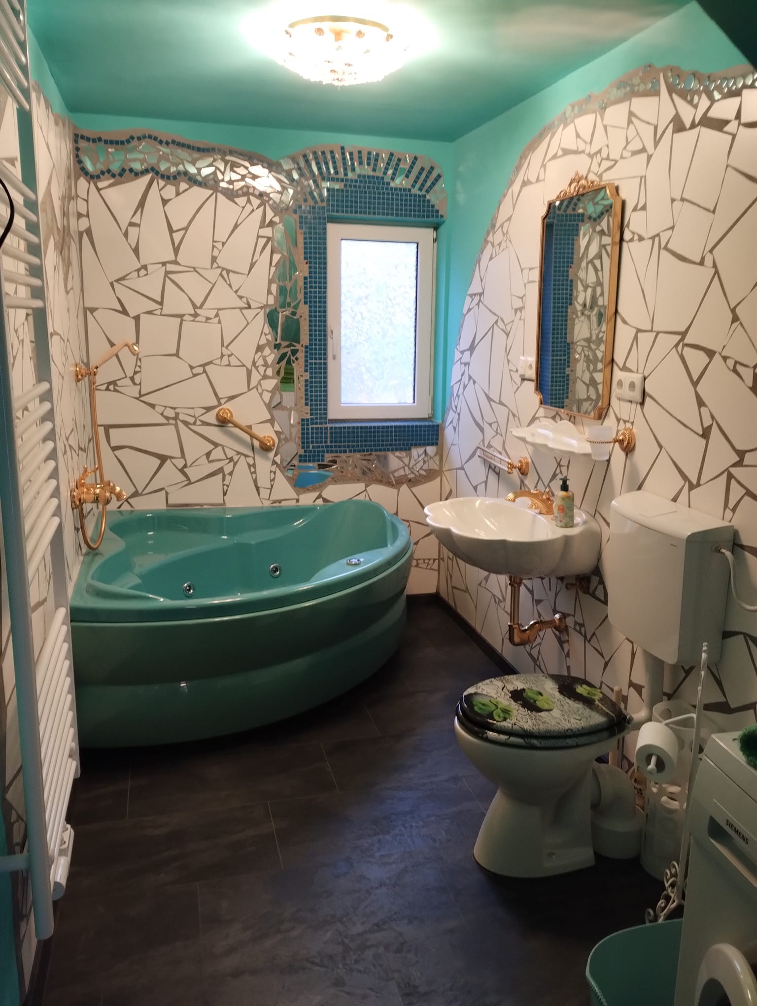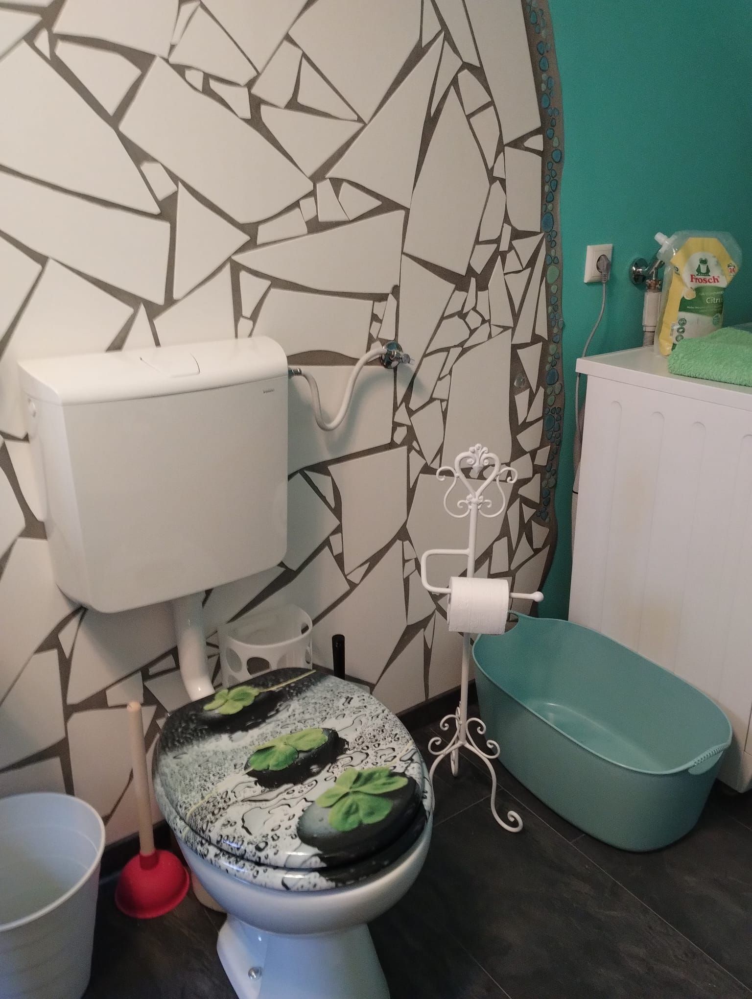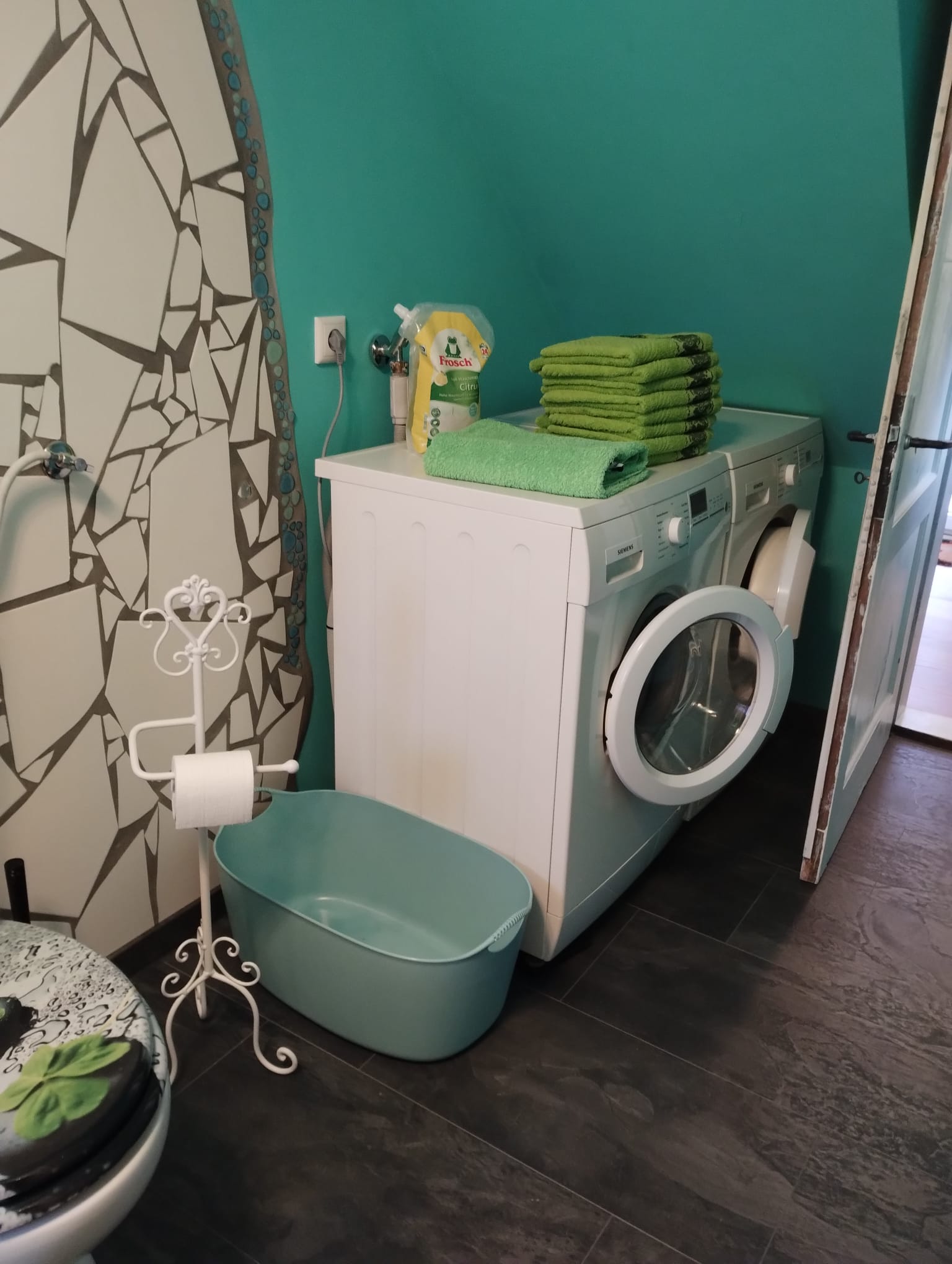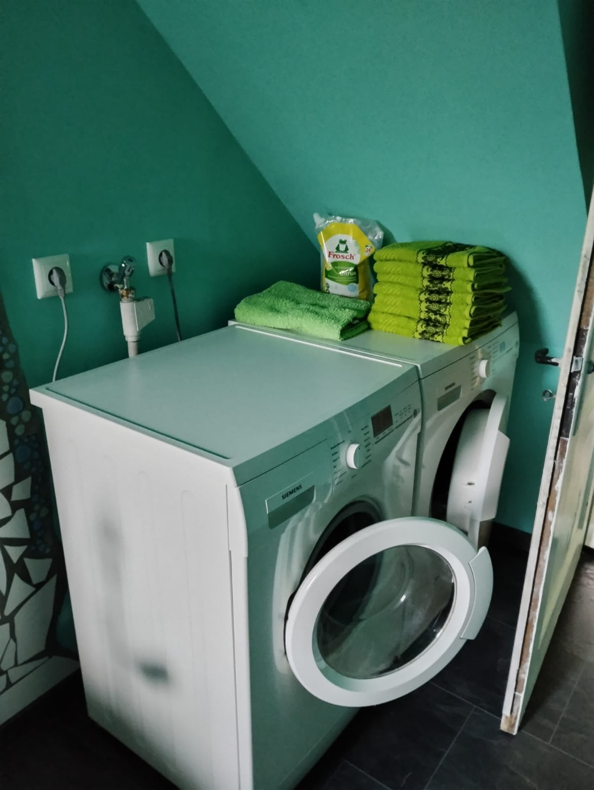 - Es gibt keine Geschirrspülmaschine, aber eine Waschmaschine und einen Wäschetrockner